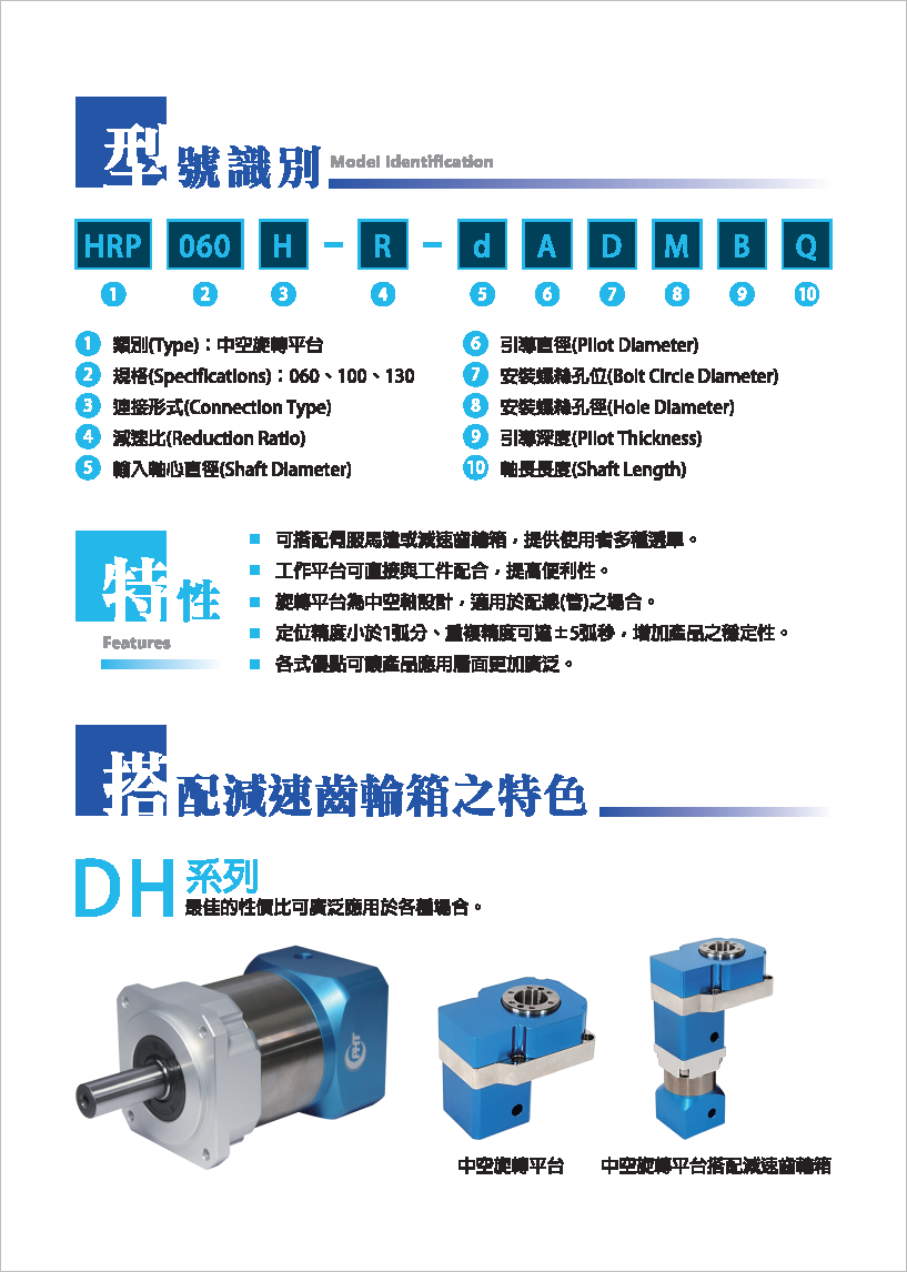 HRP系列是品宏轉角減速機系列。 可搭配伺服馬達或減速齒輪箱,提供使用者多種選擇。 工作平臺可直接與工件配合,提高便利性。 旋轉平臺為中空軸設計,適用于配管之場合。 定位精度小于1弧分,重復精度可達±5弧秒,增加產品之穩定性。 各式優點可讓產品應用層面更加廣泛。