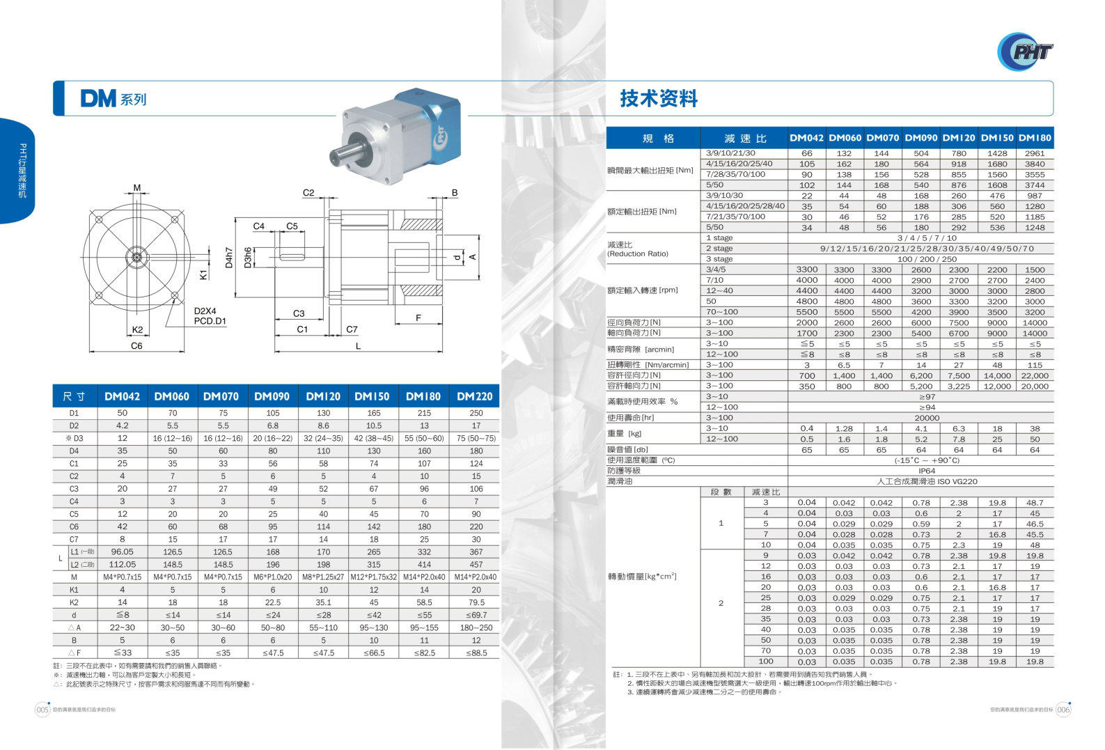 DM 系列是標(biāo)準(zhǔn)型高精度減速機(jī)。 品宏減速機(jī)的軸承是用NSK品牌的,齒輪經(jīng)過(guò)碳化,故精度和剛性都比較優(yōu)越!減速機(jī)出力軸是可根據(jù)客戶的要求去定制大小和長(zhǎng)短的。