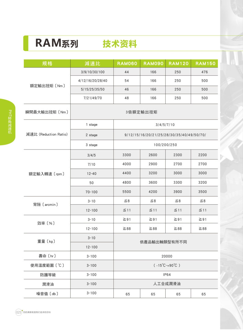 RAM系列是品宏轉角減速機系列。 鋁合金材質可提高散熱能力,減緩溫升現象造成影響。 多樣化的出力軸可因應各種場合,客制化的入力端可搭配各式馬達。 提供各式特色之減速機,供使用者依需求選購。 特殊油封設計,正常使用下不需保養亦不用更換潤滑油,可延長使用壽命。 各式特色,體積小,省空間,噪音低,輸出扭矩高,安裝容易,可搭配馬達型號廣泛。 RAM搭配DM,一體成型的齒輪組,可有效的減低噪音。 RAM搭配DH,最佳的性價比,可廣泛應用于各種場合。