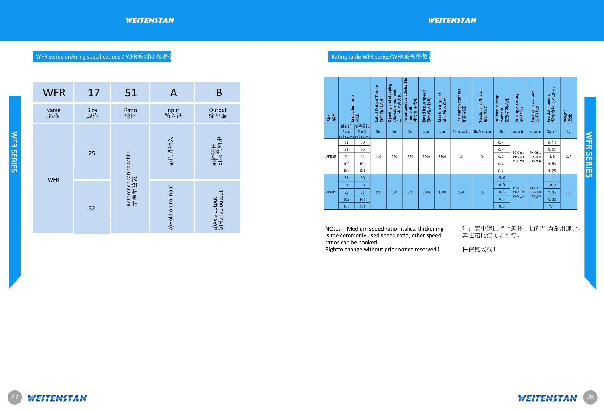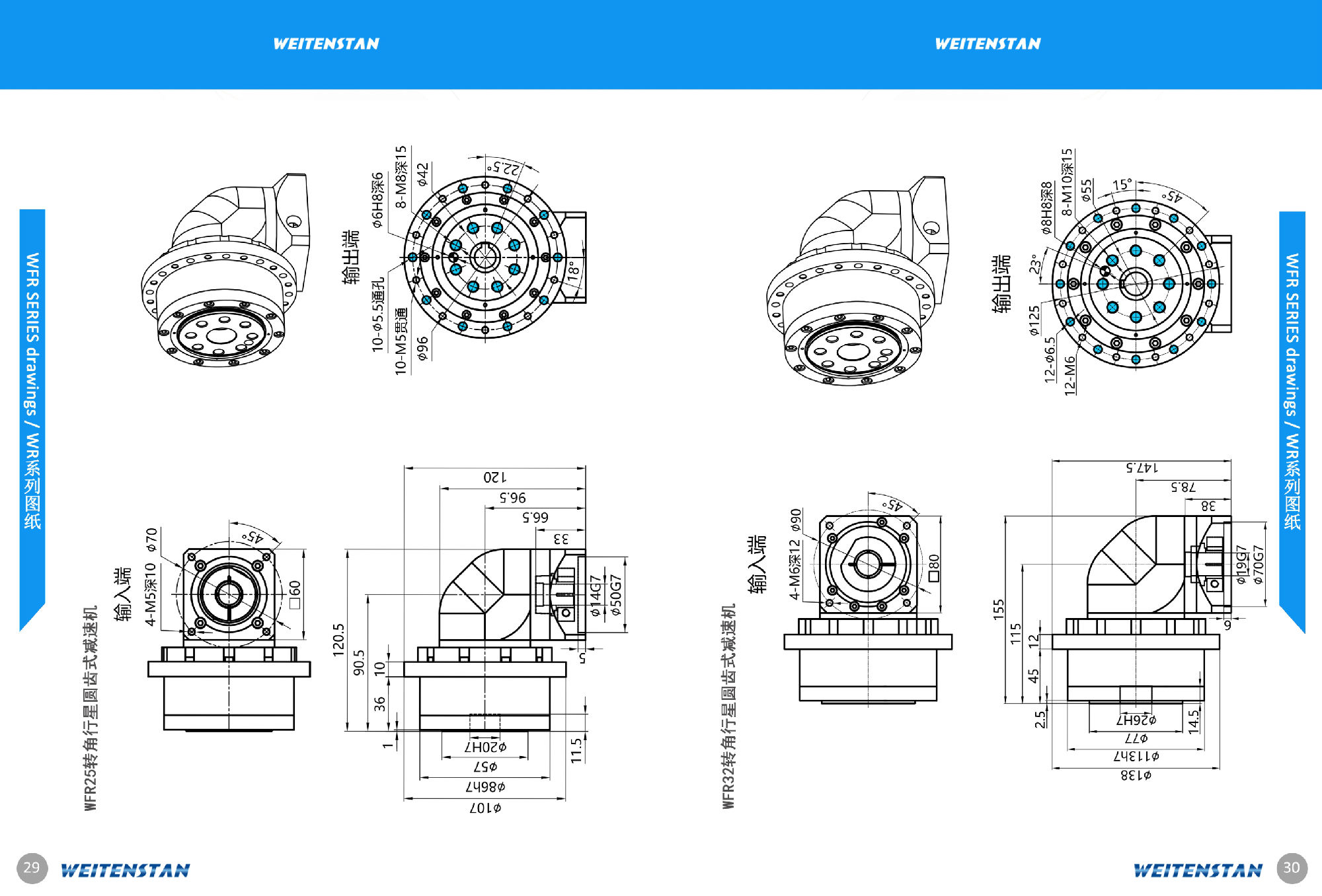 WFR系列時帶法蘭的高精度減速機,其特點時輸入和輸出的角度為90°,可大大節省安裝空間、模塊化設計可以通過法蘭安裝電機和減速機。